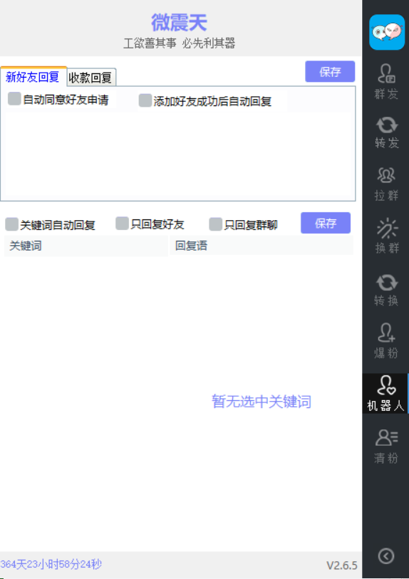微震天10.0的机器人功能也很出色,譬如新朋友回复、收款回复、关键词自动回复、朋友回复、群聊回复等功能。支持发送文本、照片、视频、文档、链接、MP3、小程序等内容。