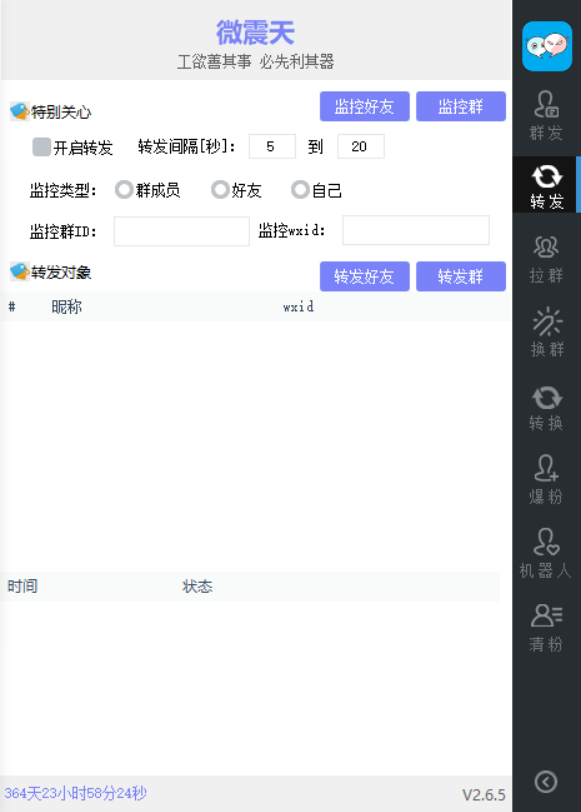 微震天10.0是一款全方位的微信营销软件,致力于让微商微信营销不在难。微易发软件安全稳定,可无限制电脑版微信多开,无限爆粉,微信极速群发,操作简单,让你真正做到,低成本,高效率。